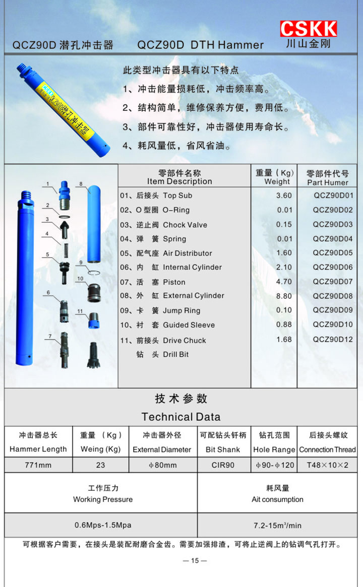 90D沖擊器此類型沖擊器具有以下特點:1,沖擊能量損耗低,沖擊頻率高。2,結(jié)構(gòu)簡單,維修保養(yǎng)方便,費用低。3,部件可靠性好,沖擊器使用壽命長。4,耗風(fēng)量低,省風(fēng)省油。